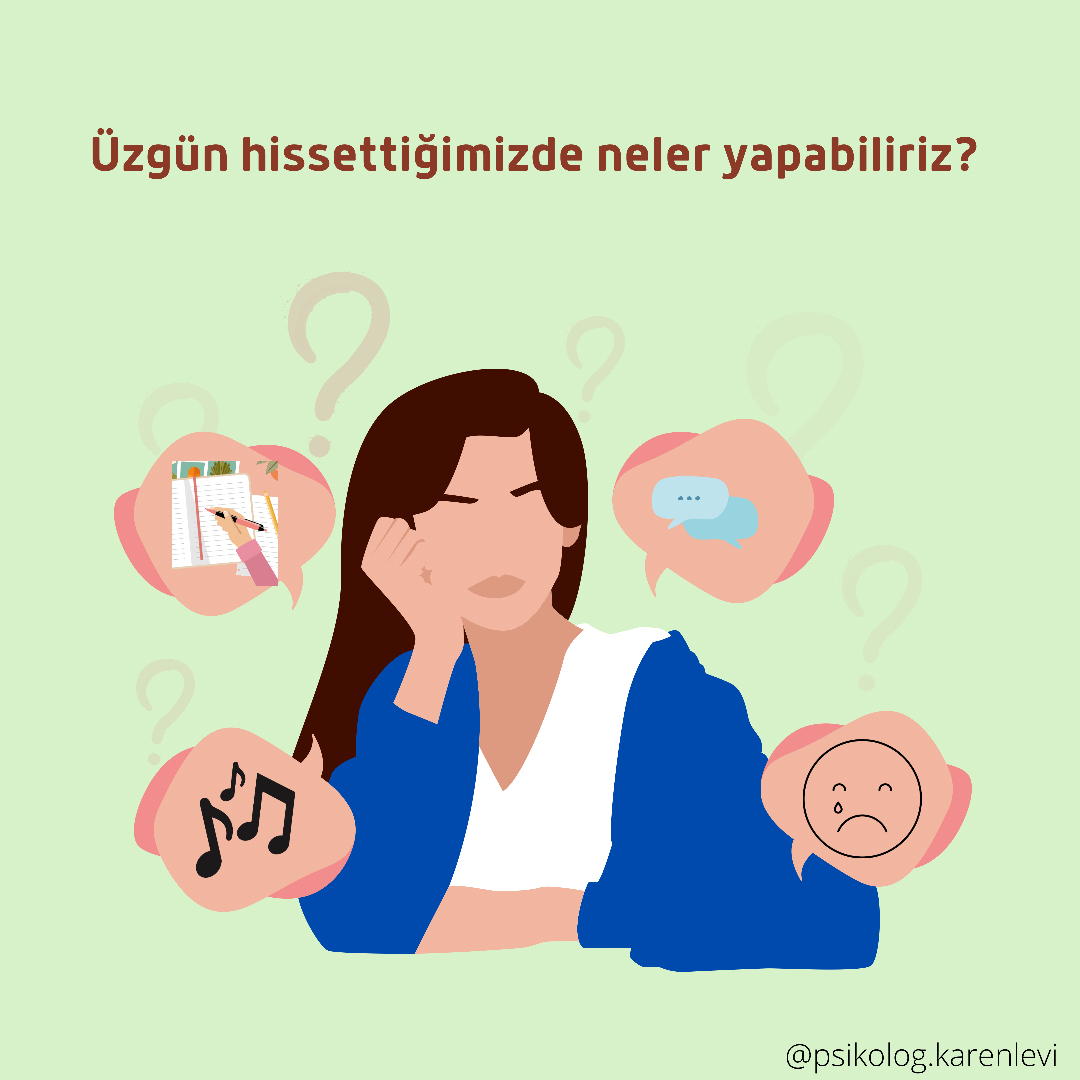 “ Kalem aklın dilidir.” demiş Cervantes. Üzgün hissettiğimiz zamanlarda duygularımızı yazarak hissettiklerimizi netleştirebiliriz. Eğer ağlamak istiyorsanız ağlayabilirsiniz, müzik dinlemek istiyorsanız sevdiğiniz bir şarkıyı açabilirsiniz. Kimilerimiz problemlerini ve üzüntülerini kendi içlerinde yaşamayı tercih ederken, siz hissettiklerinizi sevdiklerinizle paylaşabilirsiniz. Kendinizi üzüntünüz için yargılamayın, hissettiğiniz üzüntünün geçici bir duygu olduğunu, biraz zaman geçtikten sonra daha iyi hissedeceğinize hatırlayın ve inanın.